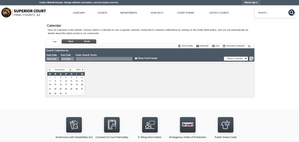 Pinal County court calendars can be checked directly through the court’s official website, offering daily updates on scheduled hearings. Users can search by case number, party name, or hearing type to find relevant court dates quickly.